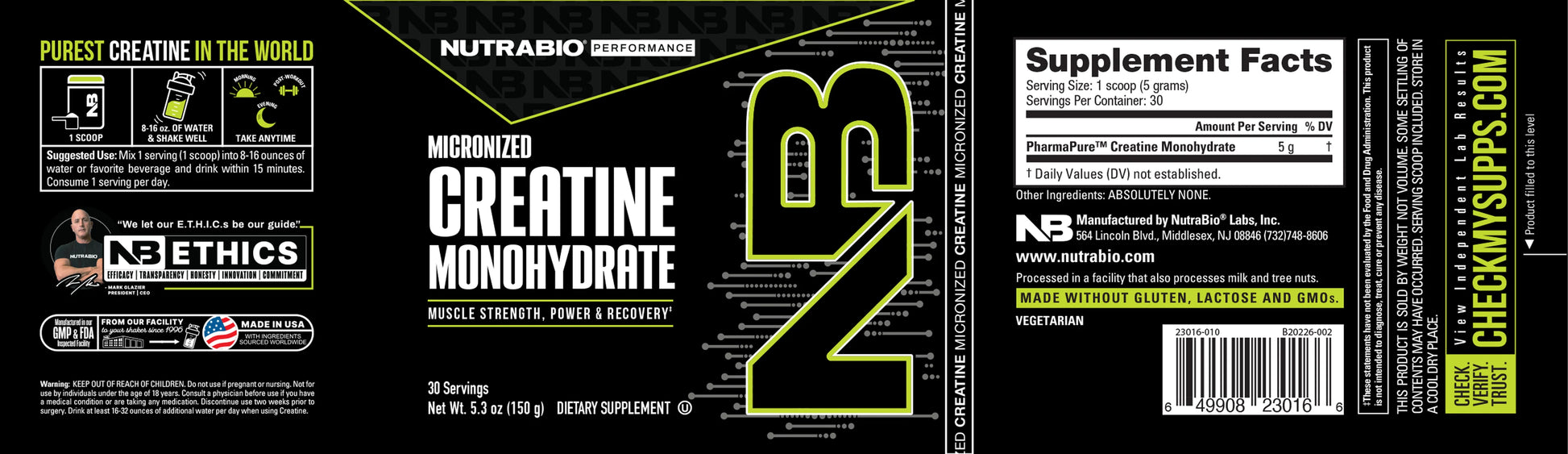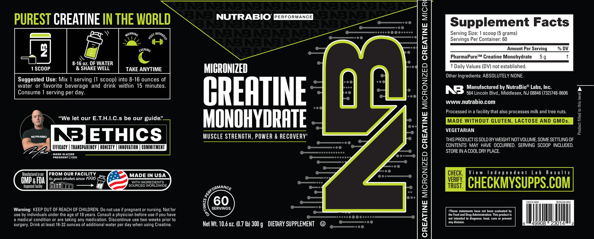 Desde 1996, NutraBio solo ha vendido los suplementos más puros. NutraBio Creatine Monohydrate es un suplemento dietético que cumple con altos estándares de pureza y certificación, lo que lo convierte en una opción confiable para los atletas. Cada lote se prueba para que sea al menos un 99,98% puro, o no se lo enviaremos; ese es nuestro compromiso de calidad. Fabricamos aquí en los Estados Unidos para cumplir con las regulaciones FDA 21 CFR Parte 111 CGMP, y todos los ingredientes se someten a análisis de última generación para garantizar la tolerancia cero a las impurezas.