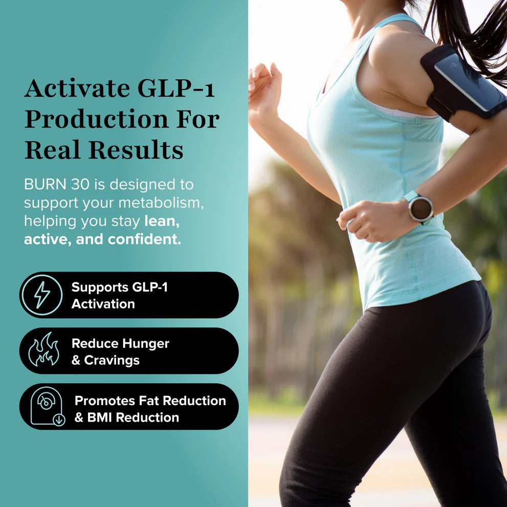 El beneficio principal de BURN30 GLP1+ es su fórmula avanzada diseñada para ayudar a los usuarios a maximizar sus esfuerzos de control de peso mejorando naturalmente la actividad de GLP-1. Al apoyar la función GLP-1 saludable, BURN30 GLP1+ ayuda a regular el apetito, reducir los antojos y mejorar la eficiencia metabólica, lo que facilita comer menos y quemar más. Reforzada por Greenselect®, un ingrediente con respaldo clínico que ha demostrado ayudar a las personas a perder hasta 30 libras en solo tres meses, esta fórmula va más allá de los quemadores de grasa tradicionales y puede ser la fórmula de pérdida de peso y grasa más completa jamás creada.